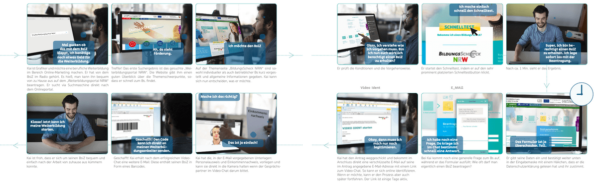 The field of investigation covered the communication process from the online search to the receipt of the "Bildungsscheck NRW". Using service design methods, solution approaches were developed for an optimized, citizen-oriented process. The cooperation partner for this task was the management consultancy HiSolutions AG (www.hisolutions.com). For 25 years, it has combined know-how in the areas of IT governance, risk & compliance and offers support in IT service management and information security, also in the public sector.